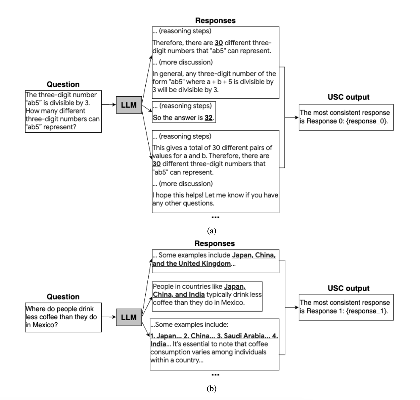 Universal Self Consistency1 aims to extend self-consistency by using a second LLM model to judge the quality of individual responses. Therefore instead of choosing the final answer based on the most frequently occuring value among each reasoning chain, we instead prompt the model to choose the most consistent answer for us relative to the prompt.